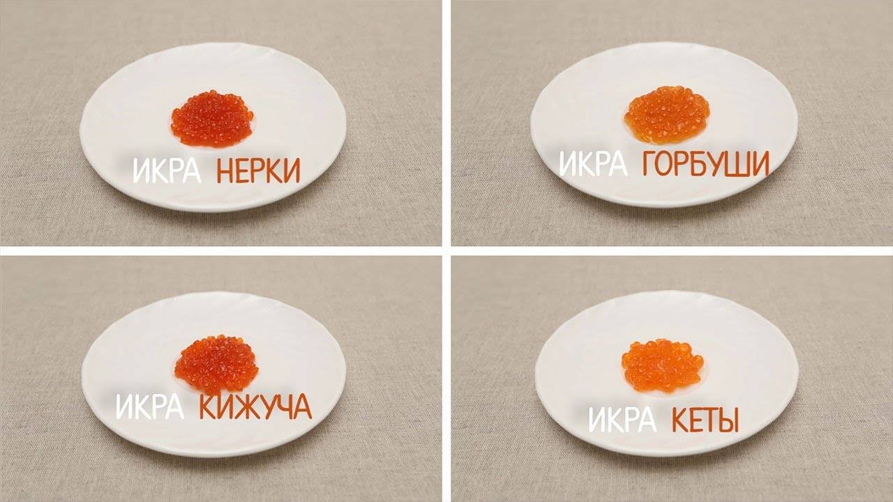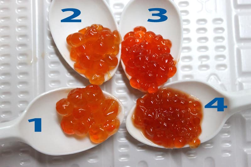 1 — икра кеты (довольно дорогая), 2 — икра горбуши (наиболее распространенная), 3 — икра форели (малораспространенная, мелкая), 4 — икра нерки (самая мелкая).