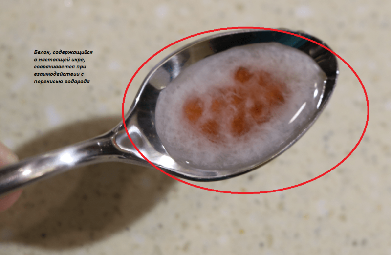 Перекись водорода в качестве окислителя вступает в реакцию с белком, имеющимся в составе натуральной икры. И белок, если он есть в икринках, сворачивается, как под воздействием горячей воды.