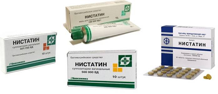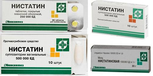 Форма выпуска: вагинальные свечи с концентрацией Нистатина 250. 500 тыс. ЕД, таблетки с оболочкой в виде пленки — 500 тыс. ЕД , мазь с концентрацией действующего вещества 100 тыс. ЕД на 1 грамм, выпускается в тубе по 15 и 25 гр., свечи ректальные 500 тыс. ЕД.
