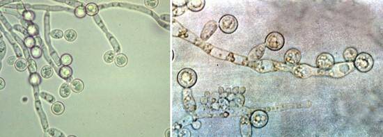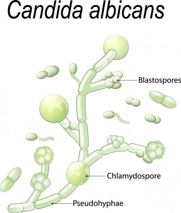 Сначала кандида адаптируется, прикрепляется к клеткам, колонизирует слизистую. Затем грибок образует псевдомицелий, который в итоге становится заметен невооруженным глазом как беловато-желтая пленка. Ее легко снять пальцем. Кроме грибницы, в составе обнаруживается слущенный эпителий и лейкоциты.
