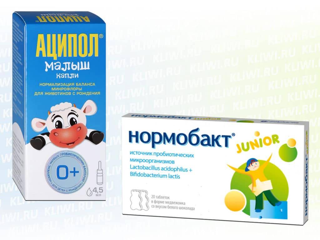 Для маленьких детей существуют специализированные и более удобные формы выпуска препаратов: Аципол малыш (капли) для детей грудного возраста и жевательные конфеты Нормобакт Junior для детей постарше.