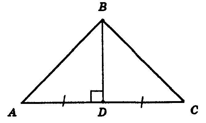 У треугольников $ADB$ и $BDC$ сторона $BD$ будет общей, следовательно, по всему сказанному выше эти треугольники равняются по первому признаку. Но тогда и стороны $AB$ и $BC$ равны.