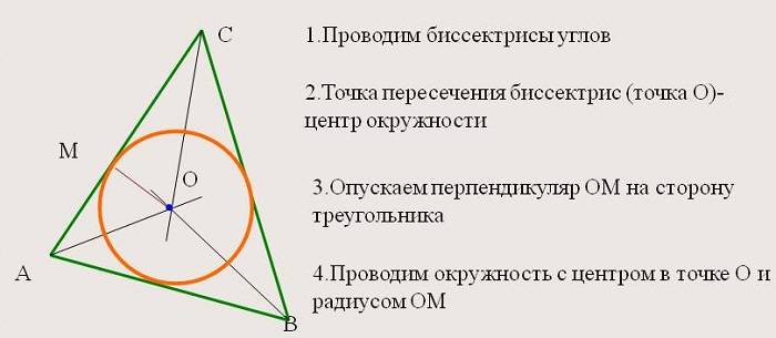 - Точка пересечения биссектрис треугольника образует центр вписанной окружности.