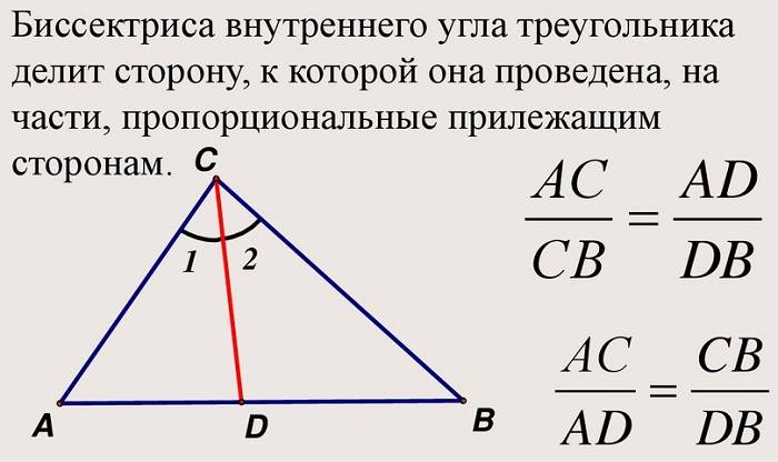 - Биссектриса делит противоположную сторону треугольника на две отрезка, пропорциональные длинам смежных сторон.