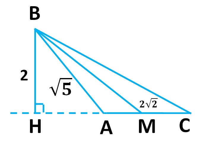 Решение. Из анализа условия задачи делаем вывод, что ∠ A — тупой. Действительно, ведь сумма всех углов в треугольнике равна 180°. Находим по теореме Пифагора длину HA = 1. Далее по теореме Пифагора находим длину HM = 2. Следовательно, AM = HM — HA = 1. При этом AM = MC = 1 (т. к. BM — медиана). Итак, HC = HA + AM + MC = 3. Следовательно, по теореме Пифагора BC = . Прямой подстановкой убеждаемся в справедливости ранее полученной формулы для длины медианы треугольника.
