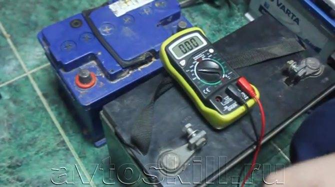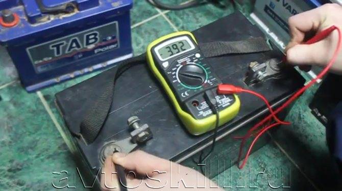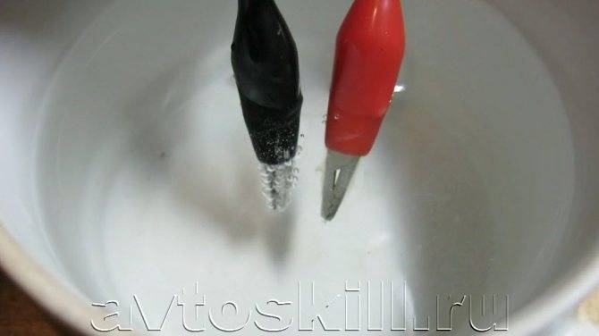мультиметра – в режиме измерения постоянного напряжения тока (U) чёрный щуп подсоединяют к предполагаемому минусу, а красный – к плюсу. Если проверяющий угадал расположение полюсов, то прибор покажет напряжение «12 В». Если полярность не совпала, то напряжение будет « -12 В»; слабого раствора кислоты, например, лимонной. К выводам аккумулятора нужно подсоединить медные провода, одним концом прикрутить по одному проводу к выводам, а другим опустить их в раствор
