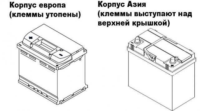 Также при покупке аккумулятора нужно учитывать отличия в изготовлении корпусов. Азиатские производители аккумуляторов располагают клеммы так, чтобы они сильно выступали над поверхностью верхней крышки. Большинство европейских компаний делают корпус более эргономичным, то есть имеют утопленные клеммы. Азиатские устройства имеют намного меньшие диаметры выводов, чем европейские. Для сравнения, Азия / Европа — штифт «+» 12,7 мм / 19,5 мм и штифт «-» 11,1 мм / 17,9 мм.