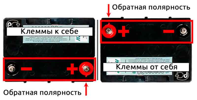 Важно отметить, что и прямая и обратная полярности АКБ распознаются при определенном положении аккумулятора относительно наблюдателя. В данном случае он располагается так, чтобы клеммы находились на лицевой поверхности ближе к нему