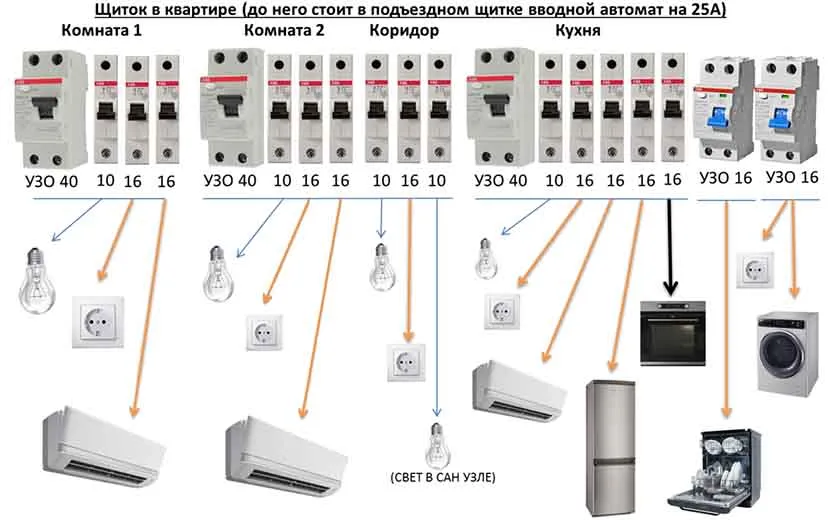 Пример распределения автоматов и УЗО по линиям и потребителямИсточник yandex.net