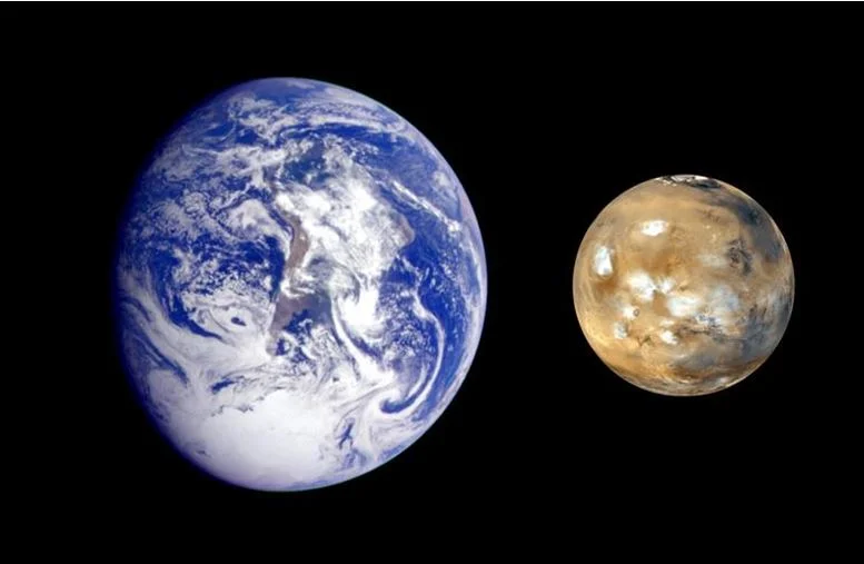 Марс и Земля. Марс – это единственная планета Солнечной системы, больше всех похожая на Землю, поэтому она вызывает особый интерес у исследователей. У красной планеты выделяют 4 времени года. Только их продолжительность зависит от полушария. На северном полушарии летом воздух максимально прогревается до -20 градусов, в то время как в южном полушарии температура может достигать +30 градусов. В 2008 году было обнаружено, что на Марсе есть вода, в летнее время она течет по склонам. Кроме этого есть северный и южный полюсы, которые, как и на Земном шаре, спрятаны подо льдом. Ученые установили, что льда на марсианской поверхности около 150 млрд.м3. Если его растопить, то он покроет всю планеты на глубину 1 м. Однако на сегодняшний день точно неизвестно, из чего именно состоит этот лед. Это может быть как вода, так и грязь или углекислый газ. Но при этом ученые берутся утверждать, что если на Марсе есть вода, то она ничем не отличается от нашей.