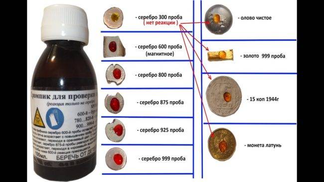 Полученный результат позволит не только проверить серебро, но и понять, что за сплав перед вами: латунный или мельхиоровый предмет станет зеленоватым, серебро низкой пробы потемнеет, а образцы 925 пробы и выше в месте воздействия станут кремовыми.