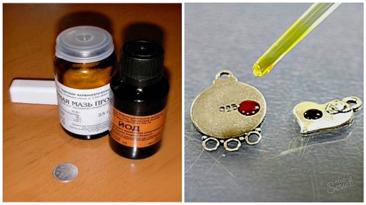 При контакте с йодом на серебре появляется темное пятно. Избавиться от него полностью практически невозможно, поэтому этот способ применим для слитков или изделий, которые не жаль. Частично нейтрализовать действие йода поможет крахмал, нанесенный на оставшийся след.