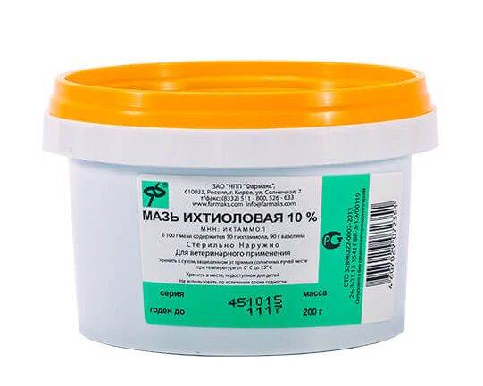 Иногда (при сильных суставных болях) используют ихтиоловую мазь для животных (20%). Как накладывать ихтиоловую мазь? Для компресса её мажут равномерным слоем толщиной несколько миллиметров. После – закрывают марлевой или другой натуральной тканью. И оставляют ихтиоловую мазь на ночь.