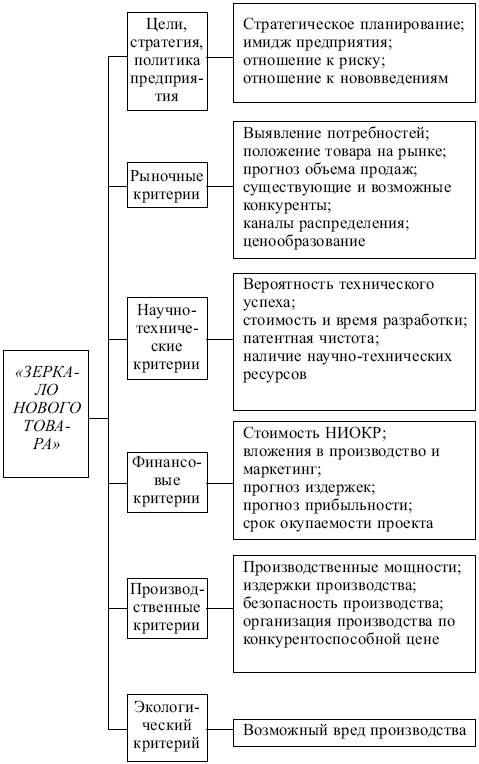 Главным условием конкурентоспособности предприятия является умение опережать конкурентов по времени выхода на рынок с новым товаром. Для этого необходимы постоянные исследования рынка, направленные на совершенствование товарного ассортимента. С этой целью после отбора наиболее перспективных идей разрабатывается «зеркало нового товара» (рис. 2.11). В результате предприятие обеспечивает экономию времени, создавая предпосылки для рыночного успеха нового товара.