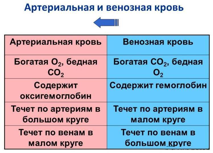 В таблице представлена сравнительная характеристика того, что такое артериальная и венозная кровь.