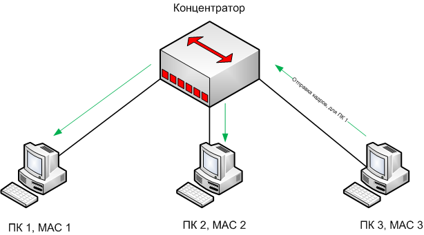 В сетевом оборудовании и устройствах, данные обычно передаются в виде кадра. Когда кадр получен, он усиливается, а затем передается на порт назначения ПК (персональный компьютер). Большая разница между хабом и коммутатором заключается в способе доставки кадров.