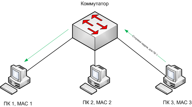 В хабе, кадр передается или «транслируется» на каждый из его портов. Это не имеет значения, что кадр предназначен только для одного порта. Хаб не может определить, на какой порт следует отправлять кадр. Кроме того, хаб 10/100 Мбит/с должен поделиться пропускную способность с каждым из своих портов. При сравнения коммутатор сохраняет запись MAC-адресов (Media Access Control) всех устройств, подключенных к нему. С этой информацией, сетевой коммутатор может определить, какая система находится на каком порту. Поэтому когда кадр получен, он точно знает, на какой порт его отправлять, без значительного увеличения времени реакции сети. Кроме того, в отличие от хаба, коммутатор 10/100 Мбит/с будет выделять полные 10/100 Мбит/с каждому из своих портов. Таким образом, независимо от количества передаваемых ПК, пользователи всегда будут иметь доступ к максимальной пропускной способности.
