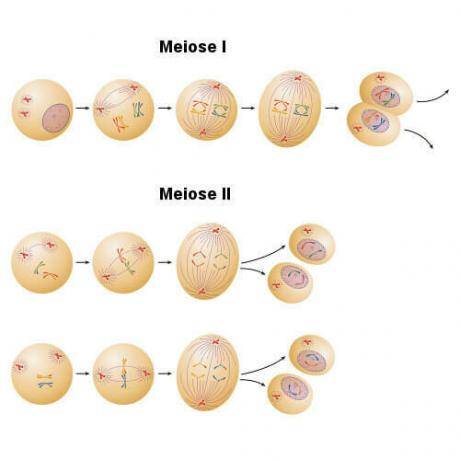 THE мейоз это процесс деления клеток, который включает два последовательных деления клеток, которые называются мейозом I и мейозом II. В мейозе I у нас есть профаза I, метафаза I, анафаза I, телофаза I и цитокинез. В мейозе II у нас есть профаза II, метафаза II, анафаза II, телофаза II и цитокинез.
