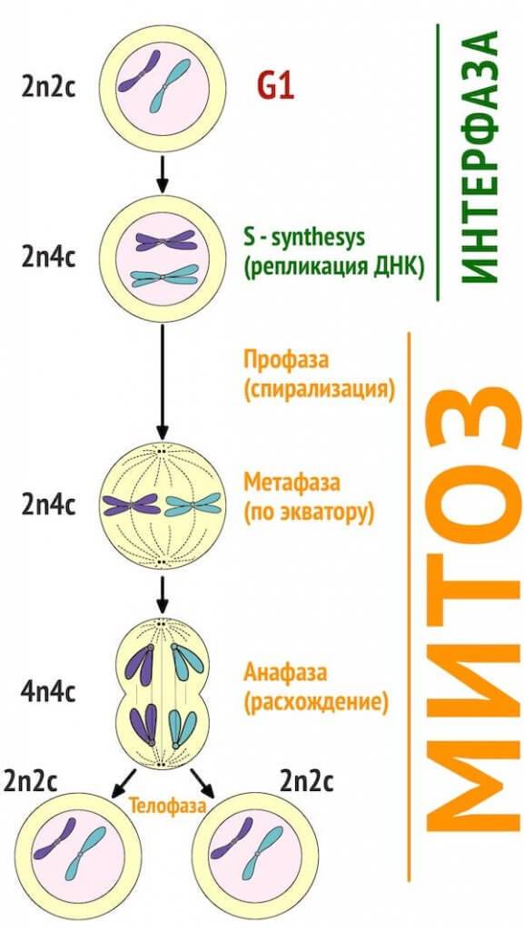 Самый распространенный способ размножения эукариотов путем непрямого клеточного деления. Также представляет собой механизм оптимального роста тканей. Основной процент цикла занимает интерфаза – этап обыкновенной жизнедеятельности клетки.