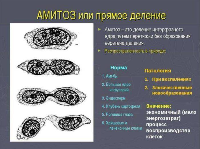 Говоря о делении клеток, стоит упомянуть об еще об одном довольно редком процессе. Для амитоза характерно разделение только ядра без удваивания генетического материала и образования связывающего хромосомы веретена. По завершению амитоза получается многоядерная клетка с неравномерно распределенным генетическим материалом.Амитоз до сих пор не изучен досконально. Он может наблюдаться как при стремительном восстановлении поврежденных и стареющих тканей, так и при развитии опухолей. Иногда так могут делиться большие ядра инфузорий и плацента млекопитающих.