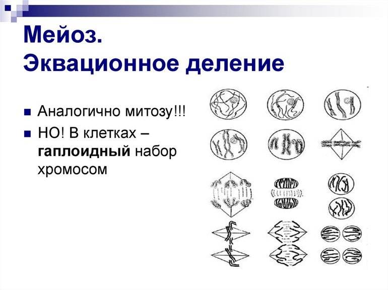 Эквационный (мейоз II ) всеми подфазами похож на митоз. Отличительной характеристикой является наличие расхождения к полюсам хроматид, а не хромосом: