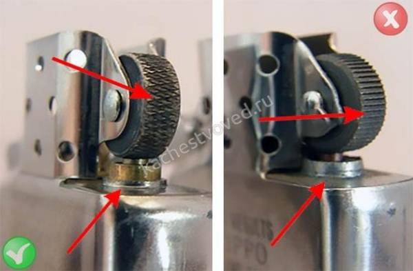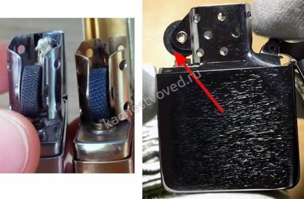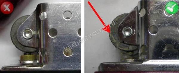 Отличить настоящую зажигалку удастся по колесу для поджигания, которое называется кресалом. Оно фиксируется на ветрозащитной части посредством заклепок – стальных или сквозных. Колесико отличается четкими симметричными насечками, которые перекрещиваются под углом в 30 градусов. Фейки часто дополняют прямые насечки.