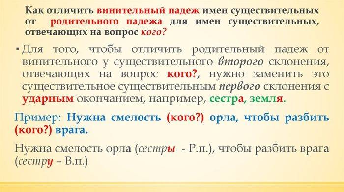 Чтобы научиться справляться с задачей, как отличить винительный падеж от родительного, необходимо научиться правильно задавать вопросы к словам и определять морфологические признаки имен существительных. Это поможет воспользоваться небольшой хитростью путем замены трудных слов на те, которые ясно различаются в этих двух падежах, т. е. на любой пример 1-го склонения.