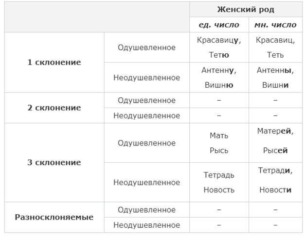Обратите внимание! Винительный падеж множественного числа существительных совпадает с формами именительного падежа (у неодушевленных существительных) и родительного падежа (у одушевленных существительных)