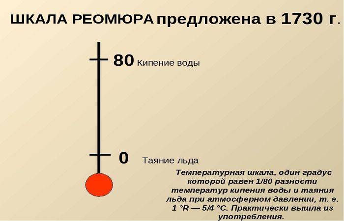 За основу при разработке данной градации ее изобретатель взял особенности и степень расширения спирта при определенных температурных показателях по шкале Цельсия. Так, согласно наблюдениям и утверждениям ученого, спирт расширяется примерно на 8 % при условии, когда происходит нагрев от температуры таяния льда до достижения точки кипения (это примерно 78 градусов по шкале Цельсия). Поэтому Реомюр установил этот показатель на своем термометре под число 80 градусов.
