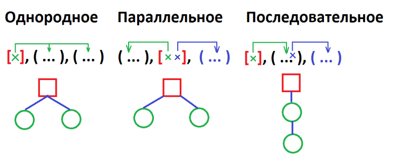 Существуют синтаксические конструкции, которые включают несколько зависимых составляющих. Они могут иметь такие виды: