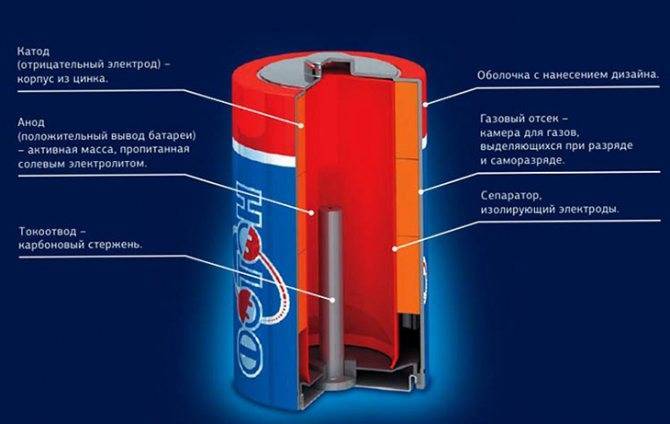 Устройство элемента чрезвычайно простое. В основе – анод – цинковый порошок, пропитывающий активное вещество батарейки – марганцевый диоксид, цинковый катод со специальными добавками (для замедления коррозионного процесса в цинке) и непосредственно электролит, представленный хлоридом аммония. Именно благодаря последнему солевая батарейка получила свое название, ведь электролит, содержащийся в ней, по сути, соль.