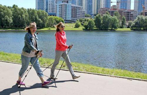 Фото 1. Ходьба со скандинавскими палками. Может стать хорошей альтернативой бегу для похудения.