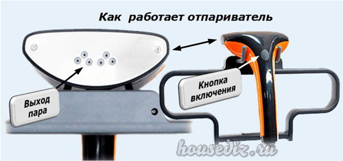 В самом начале работы отпаривателя необходимо налить воду в специальный резервуар, после чего прибор включается. Встроенный нагревательный элемент быстро нагревает воду, и она превращается в пар, который выходит через специальный шланг или струю на поверхность одежды.