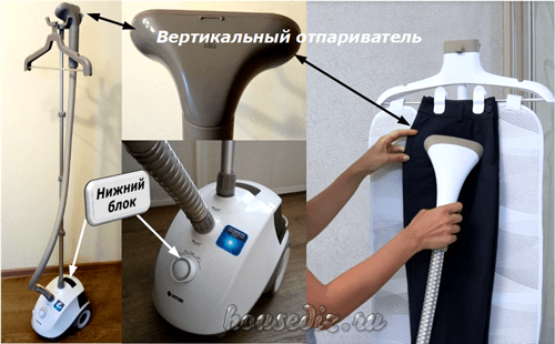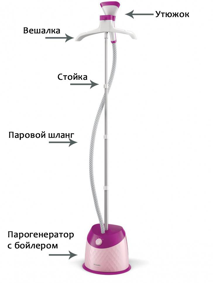 Вертикальный (напольный) отпариватель состоит из большого бойлера, вертикальной стойки и утюжка с длинным шлангом.