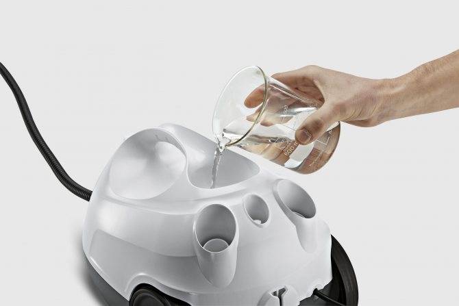 Резервуар для воды чаще является съемной конструкцией. Перед началом работы его надо заполнить водой. В инструкции на конкретную модель указывается, какая вода для нее подходит. Тара вставляется в корпус прибора, где вода нагревается с помощью ТЭНа. Горячий пар скапливается, набирает давление, после чего по шлангу поступает к утюжку. Подошва утюжка имеет множество отверстий для выхода пара, через них пар подается к ткани. Температура пара может быть 100 и выше градусов.