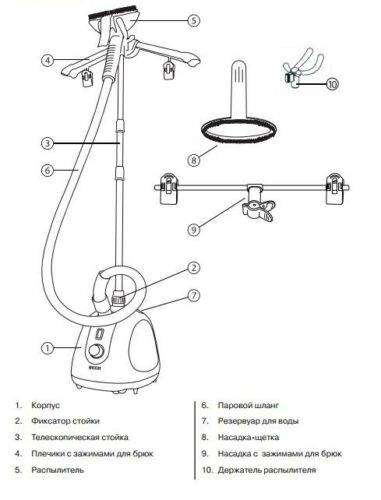 Прибор состоит из парового утюжка, стойки с вешалкой, шланга для подачи пара и парогенератора, помещенного в пластиковый корпус: