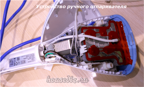 При включении прибора в сеть подошва накаляется до нужной температуры. Вода, залитая в камеру, при нажатии кнопки «паровой удар» порционно поступает в резервуар, где моментально нагревается, соприкасаясь со скрытым ТЭНом, и в виде пара выходит через отверстия в подошве.