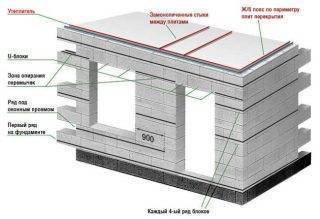 По периметру стен из обоих материалов делают армированный железобетонный пояс, чтобы на него опирать плиты перекрытия или несущие балки, фермы. Для кладки газоблоков и пеноблоков используют цементно-песчаный раствор или специальный клей. Первый ряд всегда ставят на растворе.