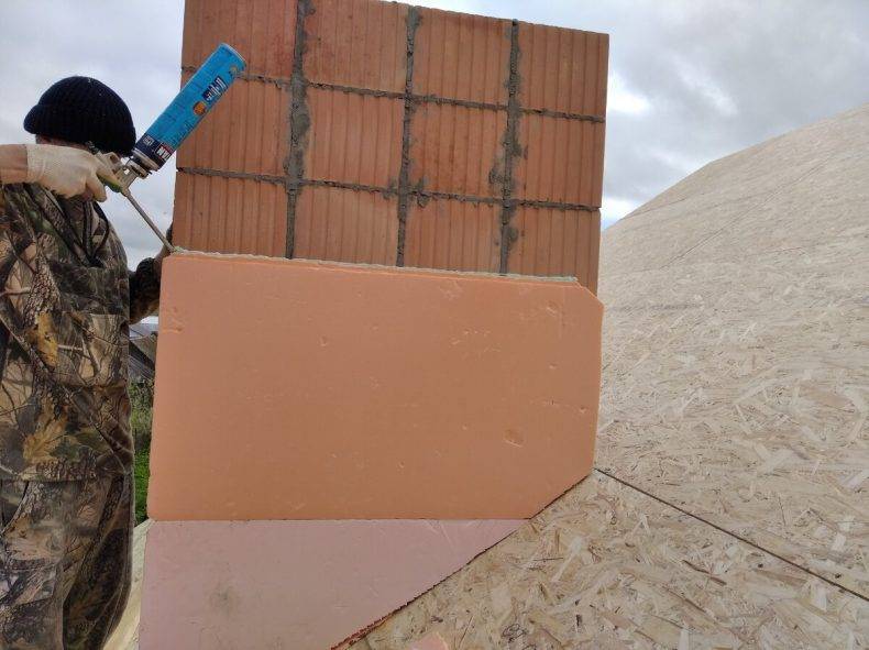 Когда внешний слой надежный — можно приступать к монтажу пенополистирола. Закрепляется утеплитель очень просто — специальный клей (как сухая смесь, которая разводится водой, так и клей пена) наносится на панель по периметру, а затем блок приклеивают стене. Чтобы держалось надежнее — сверху закрепляют дюбелями. Из расчета один лист — 5 дюбелей.