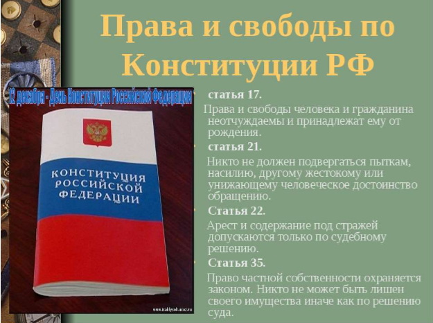 – право на достоинство личности (ст.21) – предполагает, что государство создает для человека такие условия жизни, которые бы не умаляли его достоинство;
