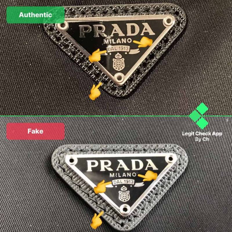 У настоящей сумки Prada на лицевой стороне изделия (в зависимости от задумки дизайнера) спереди, сзади или сбоку есть логотип компании. Он выглядит, как пластина из металла, прикрепленная к изделию заклепками. Символы надписи немного объемные, а оттенок эмали близок к оттенку самой модели. На некоторых сумках он может пришиваться нитками, а пластина не металлическая, а кожаная. Все интервалы между буквами и символами пропорциональные. В зависимости от времени изготовления, коллекции буква R может иметь прямую или изогнутую правую ножку. На репликах эта деталь параллельно с правой ножкой буквы A.