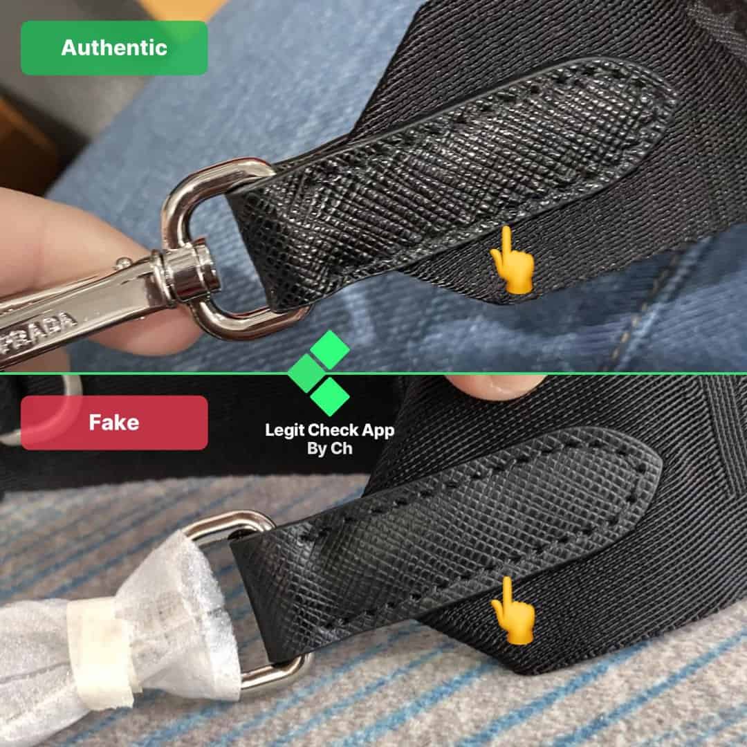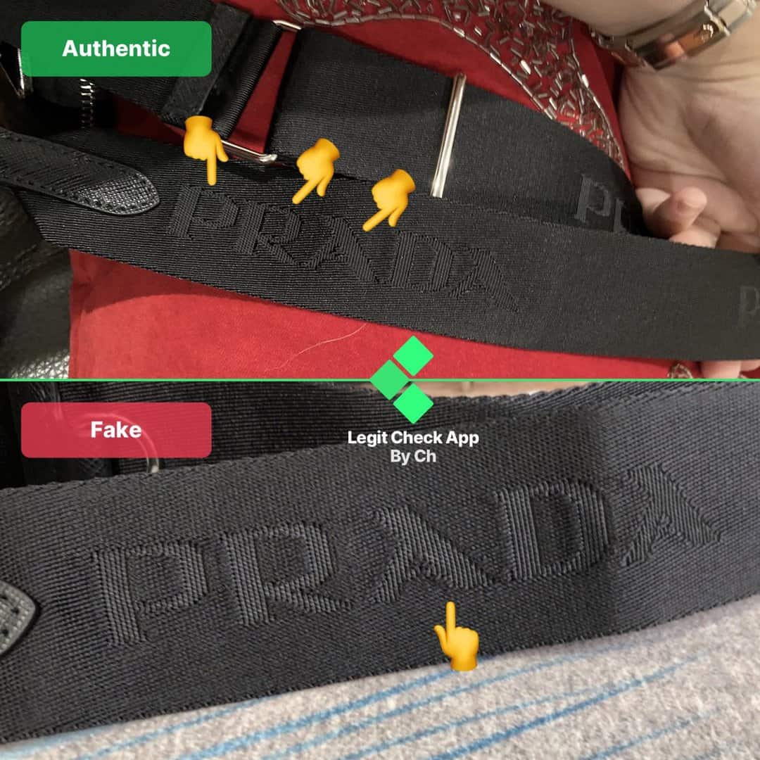 You can tell if a Prada Re-Edition 2005 is real or fake by inspecting the “PRADA” label inside the bag. A fake Prada always has the text thinner and with more space between the letters compared to a real label.