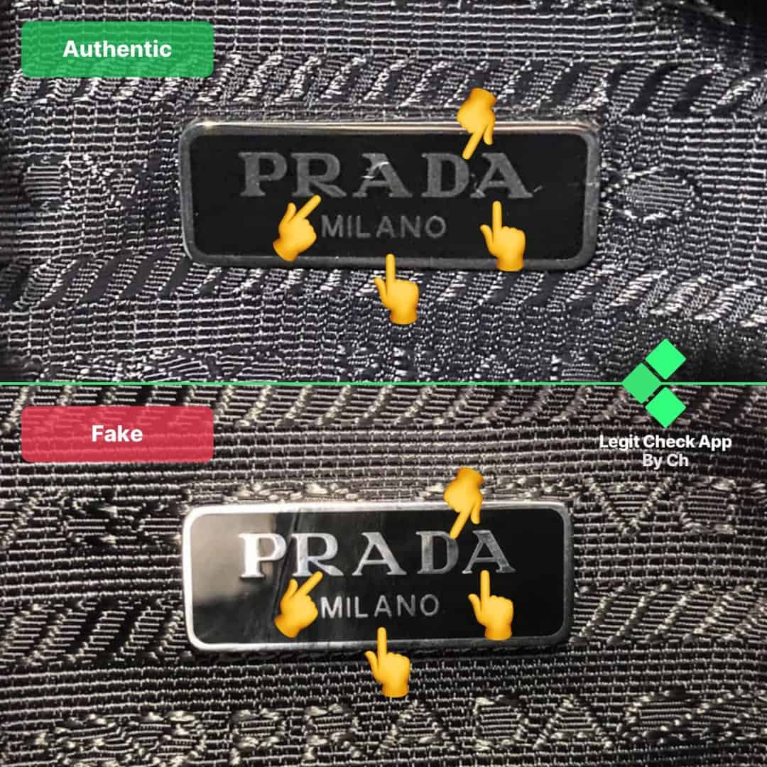 У настоящей сумки Prada на лицевой стороне изделия (в зависимости от задумки дизайнера) спереди, сзади или сбоку есть логотип компании. Он выглядит, как пластина из металла, прикрепленная к изделию заклепками. Символы надписи немного объемные, а оттенок эмали близок к оттенку самой модели. На некоторых сумках он может пришиваться нитками, а пластина не металлическая, а кожаная. Все интервалы между буквами и символами пропорциональные. В зависимости от времени изготовления, коллекции буква R может иметь прямую или изогнутую правую ножку. На репликах эта деталь параллельно с правой ножкой буквы A.
