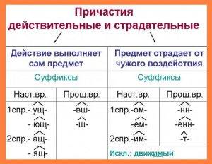 Процесс формирования рассматриваемых частей речи зависит от их разновидности. Все причастия делятся на действительные и страдательные. Первая форма представляет активный признак и может формироваться от переходных и непереходных глаголов. Страдательные разновидности представляют пассивный признак и формируются исключительно от переходных глаголов.