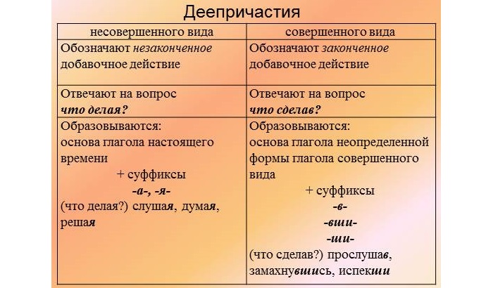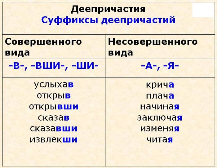 Деепричастия образуются от глаголов соответствующего вида. Таблица 1.