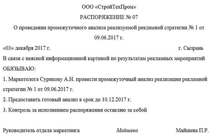 Распоряжения же обычно используются для решения задач, связанных с более широкими вопросами управления организацией. Например, распоряжение можно использовать для назначения обязанностей руководителей отделов, изменения структуры компании, создания новых подразделений и многих других вопросов.
