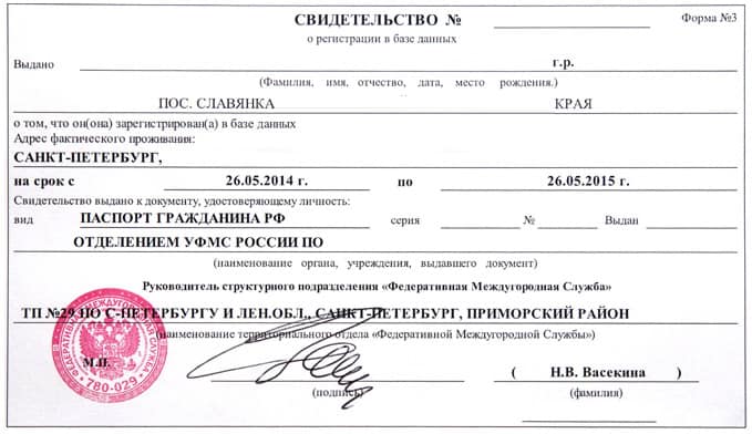 После подачи документов гражданин может попросить выдать ему справку о приеме документов для оформления регистрации по месту жительства в произвольной форме, заверенную печатью. По прошествии трех дней вы должны повторно явиться в подразделение ГУВМ МВД, чтобы получить регистрацию.