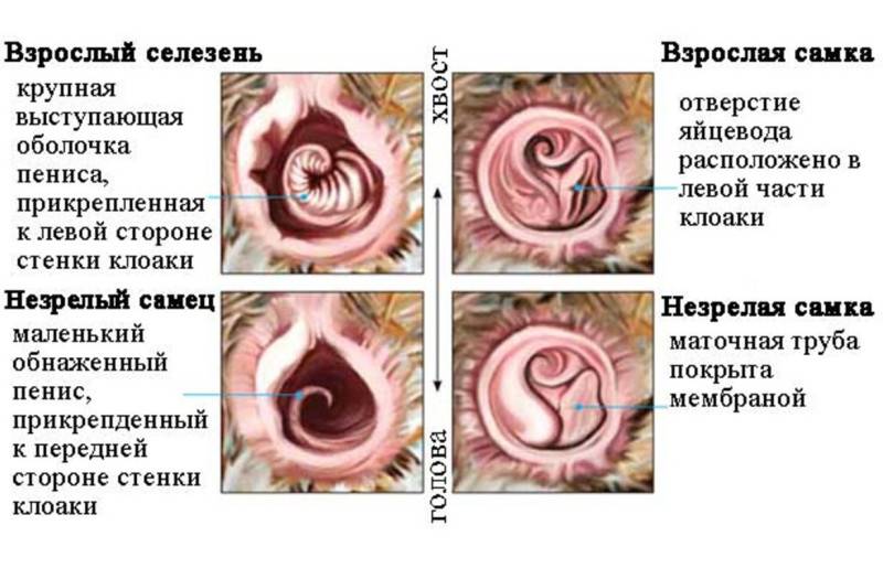Более правдивым признан японский вариант медицинского распознавания, основанный на различиях в половой системе. У селезней имеется так называемый псевдопенис – небольшая складка размером около 3-4 мм. Чтобы его найти, необходимо взять птицу в левую руку, повернуть ее головой к себе и раскрыть правыми пальцами анальное отверстие, затем повернуть. У самок можно будет обнаружить плоские шарообразные наросты, у самцов – рудимент спиралевидного члена.