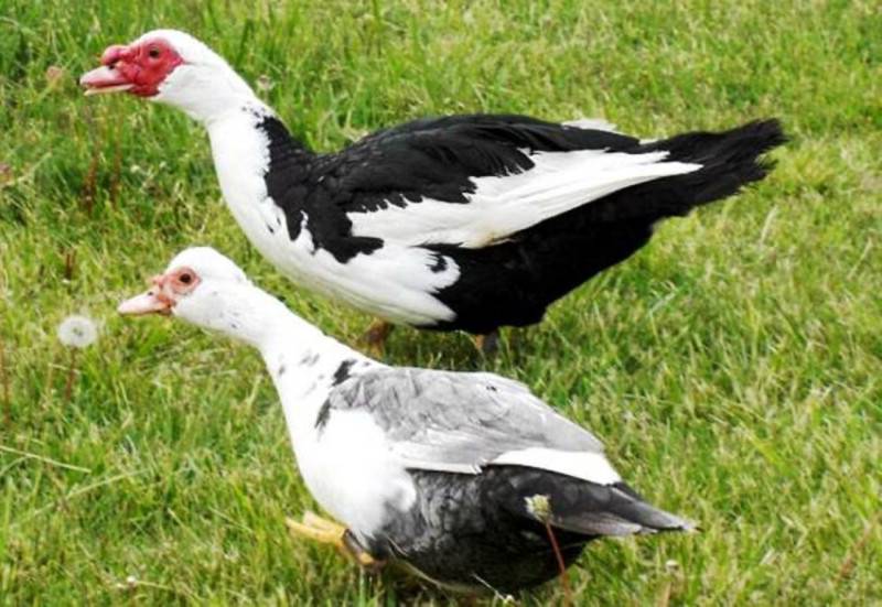 - мускусные утки. Главными отличиями породы являются наросты вокруг глаз и у основания клюва. У селезня они ярко-красного цвета, имеют вид больших бородавок. У уточек нарост небольшой, имеет розоватый оттенок. Оперение у самца чёрно-белое. Голова и грудь отливают зелёным цветом. Самки равномерно пёстрые;