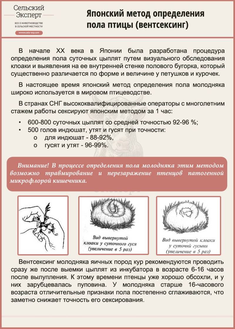 С помощью этого способа можно вычислить половую принадлежность с точностью от 98% до 100%, причем даже однодневных малышей можно отсортировать по половой принадлежности. Следует быть предельно аккуратным, используя этот метод, поскольку манипуляции по распознаванию пола могут быть опасными для молодняка. Чтобы добиться точных данных необходимы лишь время и натренированный глаз!